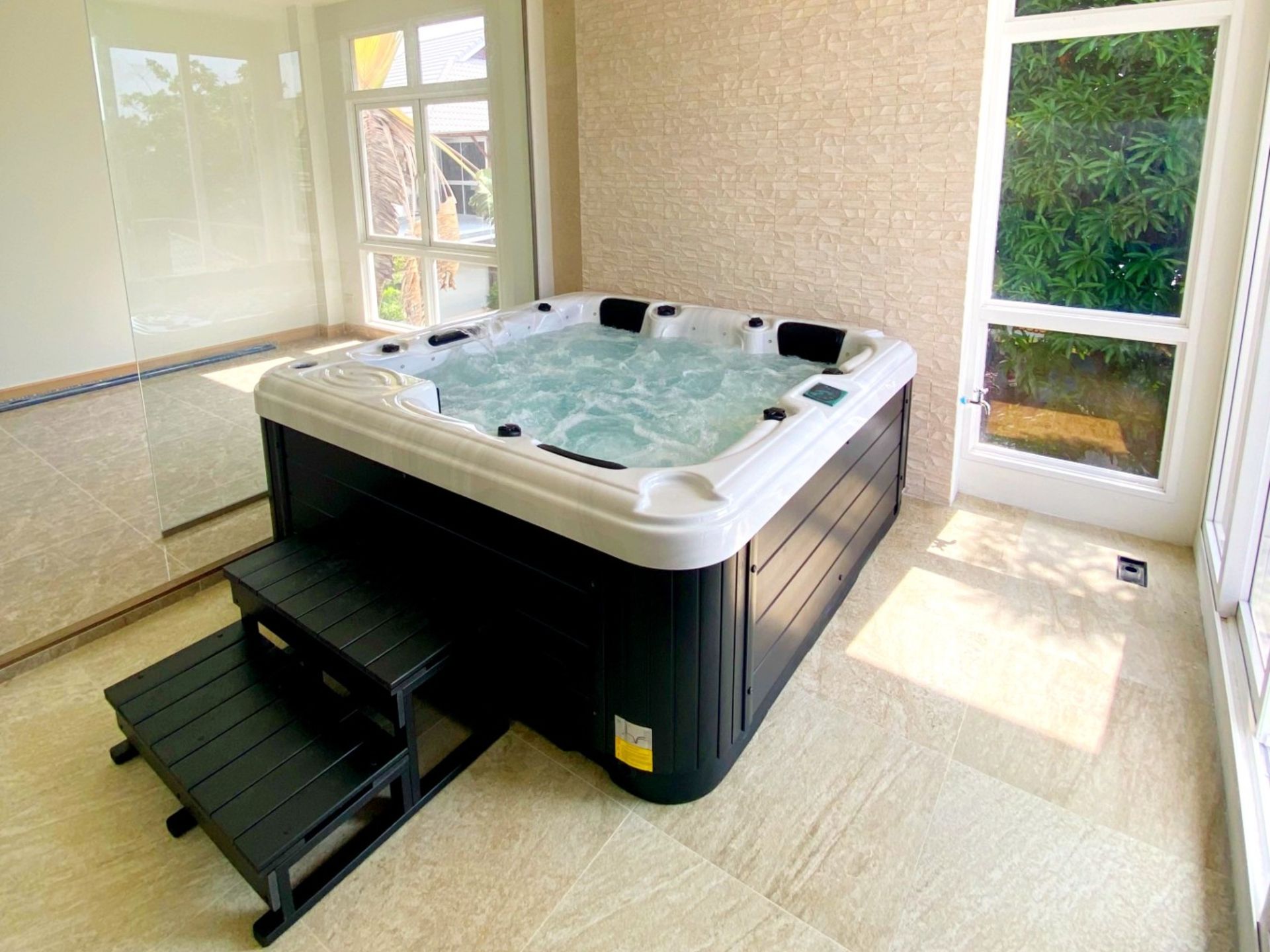 ลูกค้าเลือกติดตั้งอ่างน้ำร้อน ในห้องกระจก บริเวณสวนต้นไม้ของพื้นที่หน้าบ้าน เพื่อสร้างมุมพักผ่อนส่วนตัว สำหรับการแช่น้ำอุ่นนวดตัวในอ่าง พร้อมรับสายลมเย็นสบายผ่านช่องหน้าต่าง สร้างความผ่อนคลายกับร่วมคนรักได้ทุกวัน