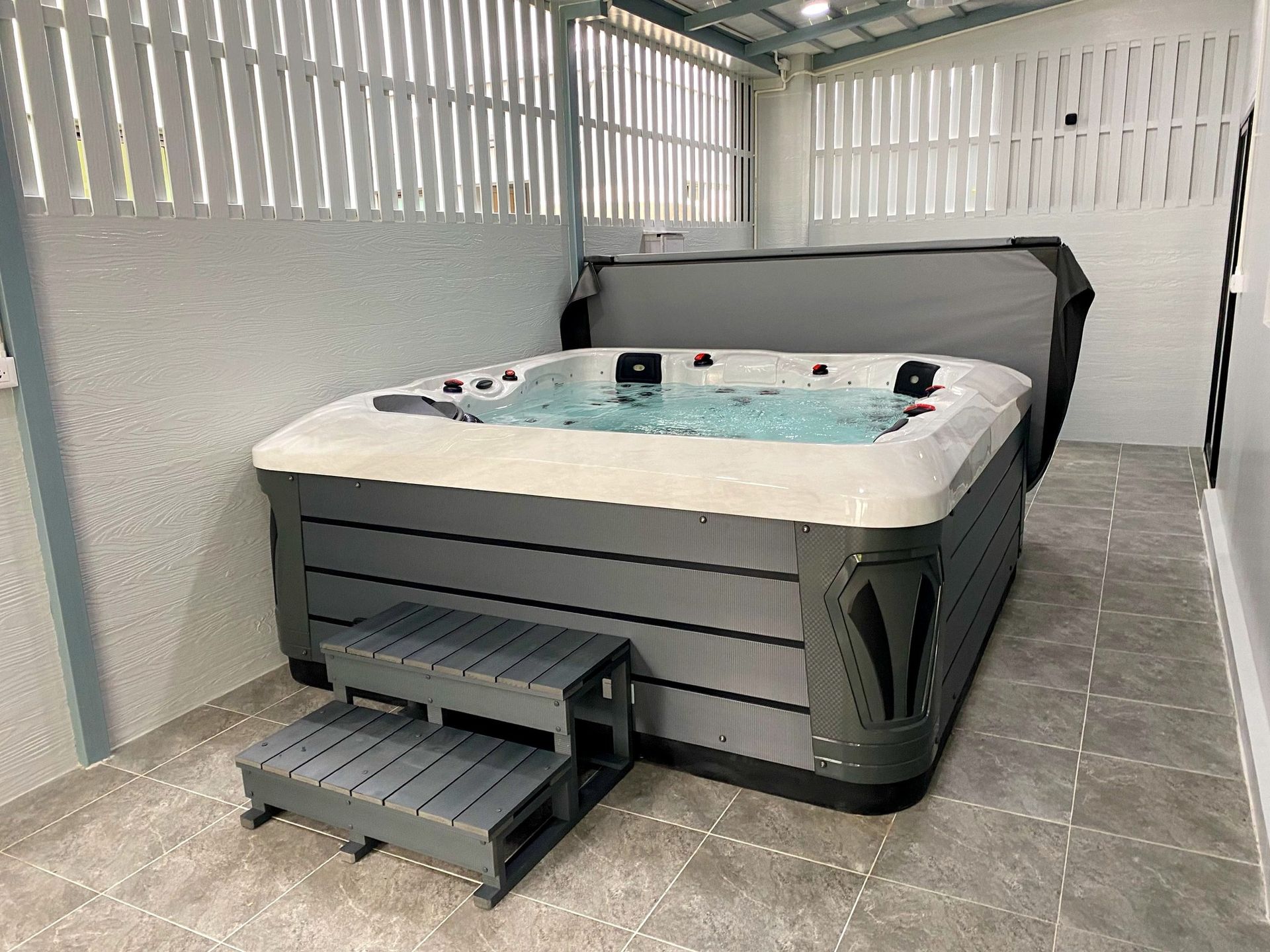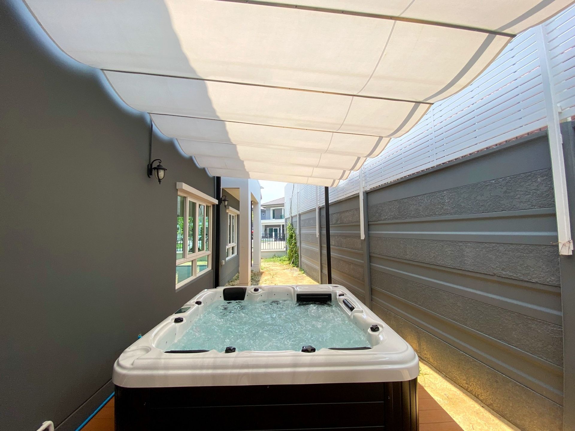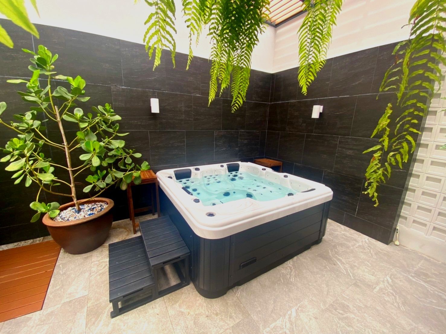 ลูกค้าเลือกใช้พื้นที่ข้างบ้าน ริมกำแพง ซึ่งเป็นจุดที่มีช่องลมอากาศถ่ายเทได้สะดวก เปลี่ยนให้กลายเป็นพื้นที่สำหรับแช่น้ำอุ่นแบบส่วนตัวร่วมกับสมาชิกในครอบครัว